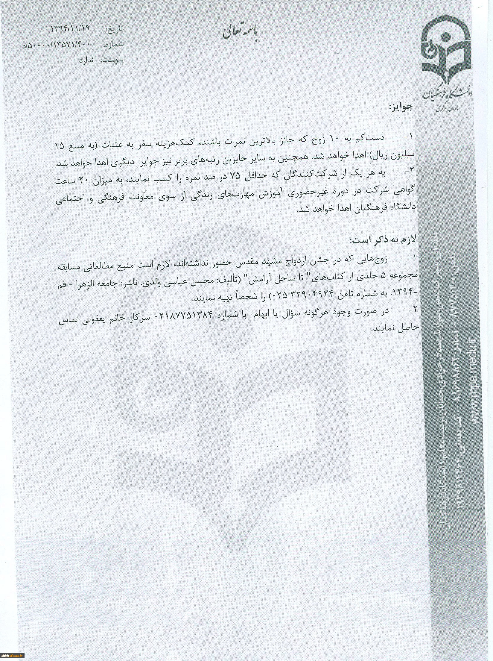 امتیاز دهید : مسابقه ی کتابخوانی تا ساحل آرامش ویژه زوج های جوان دانشجویی شنبه 24 بهمن 1394 ساعت 13:52