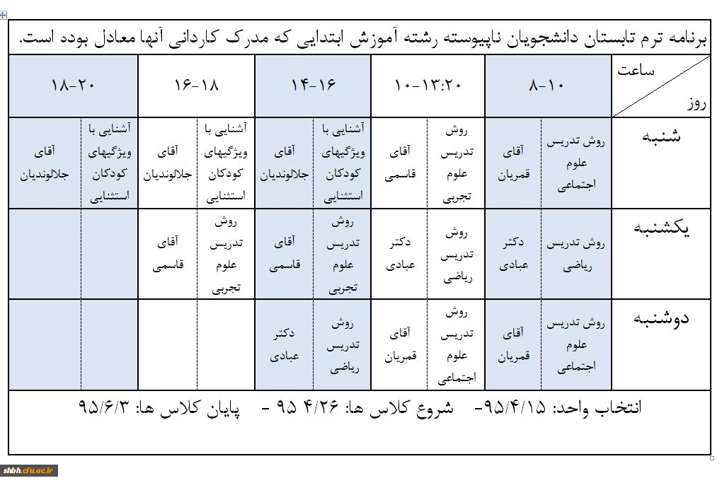 دروس ترم تابستان دانشجویان ناپیوسته آموزش ابتدایی که مدرک کاردانی آنها معادل بوده است.